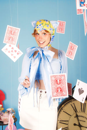 Say hello to your inner garden guardian. This pastel floral cat bonnet, crafted from light cotton, features gentle pointed ears and satin ribbon ties for a dreamy, delicate look. Wrap it around your chin and transform into a curious kitty straight from a secret flower-filled glade.