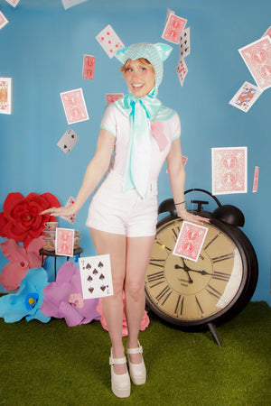 Say hello to your inner garden guardian. This pastel gingham cat bonnet, crafted from light cotton, features gentle pointed ears and satin ribbon ties for a dreamy, delicate look. Wrap it around your chin and transform into a curious kitty straight from a secret flower-filled glade.