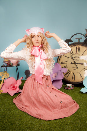 Say hello to your inner garden guardian. This pastel gingham cat bonnet, crafted from light cotton, features gentle pointed ears and satin ribbon ties for a dreamy, delicate look. Wrap it around your chin and transform into a curious kitty straight from a secret flower-filled glade.