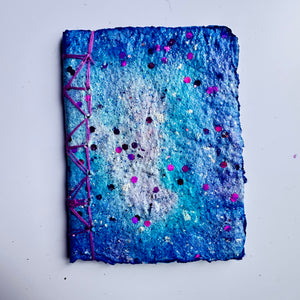 This pocket-sized 3x4" treasure features a handmade, hand-painted cover, lovingly sealed with a touch of Mod Podge magic. Inside, you’ll find 24 sheets (that’s 48 pages!) of blank paper, ready to hold your doodles, daydreams, and dragon sightings. Each spine is hand-bound with care and a bit of mischief.
